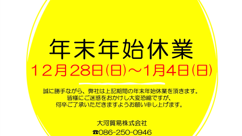 平素より大河貿易株式会社をご利用いただき、誠にありがとうございます。 誠に勝手ながら、弊社では下記の期間を年末年始休業とさせていただきます。 ※2026年1月5日(月)より通常営業を開始いたします。 ※休業期間中にいただ […]